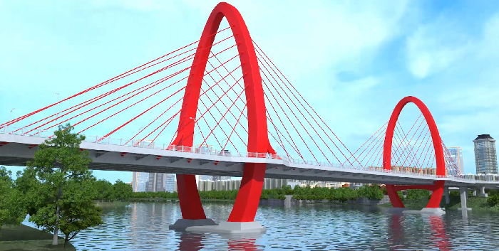 芝山橋南起福建省漳州市江濱路,跨越九龍江西,止于瑞京路—芝山南路交叉口,是福建省重點工程。主橋長300米,橋面寬36米,雙向6車道,采用雙塔雙索面斜拉橋。福船集團承接其中鋼梁、鋼塔柱制作及安裝工程,工程總量約0.5萬噸。其中編制并實施的鋼主塔無支撐搭載方案充分體現了馬尾造船的技術實力。